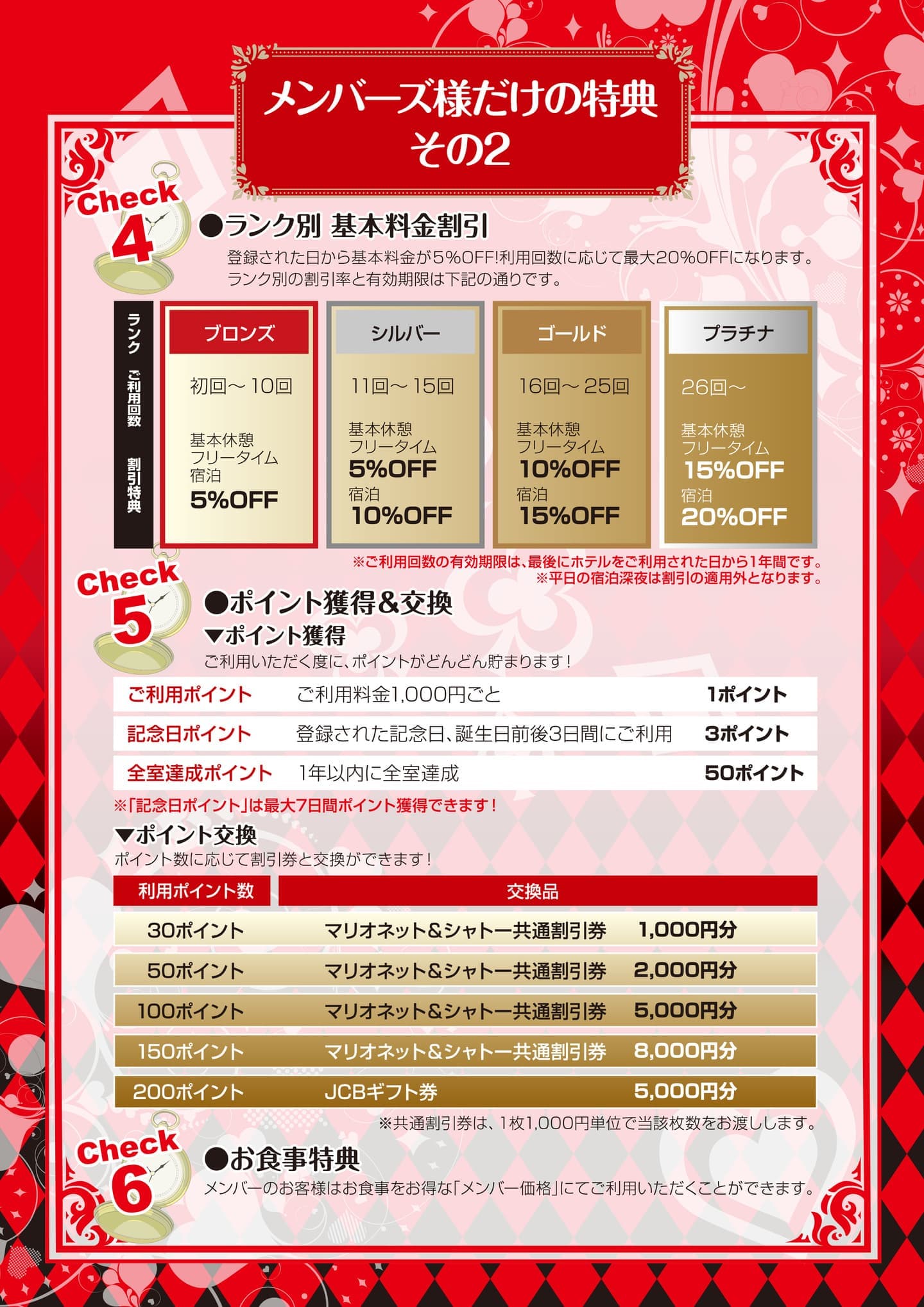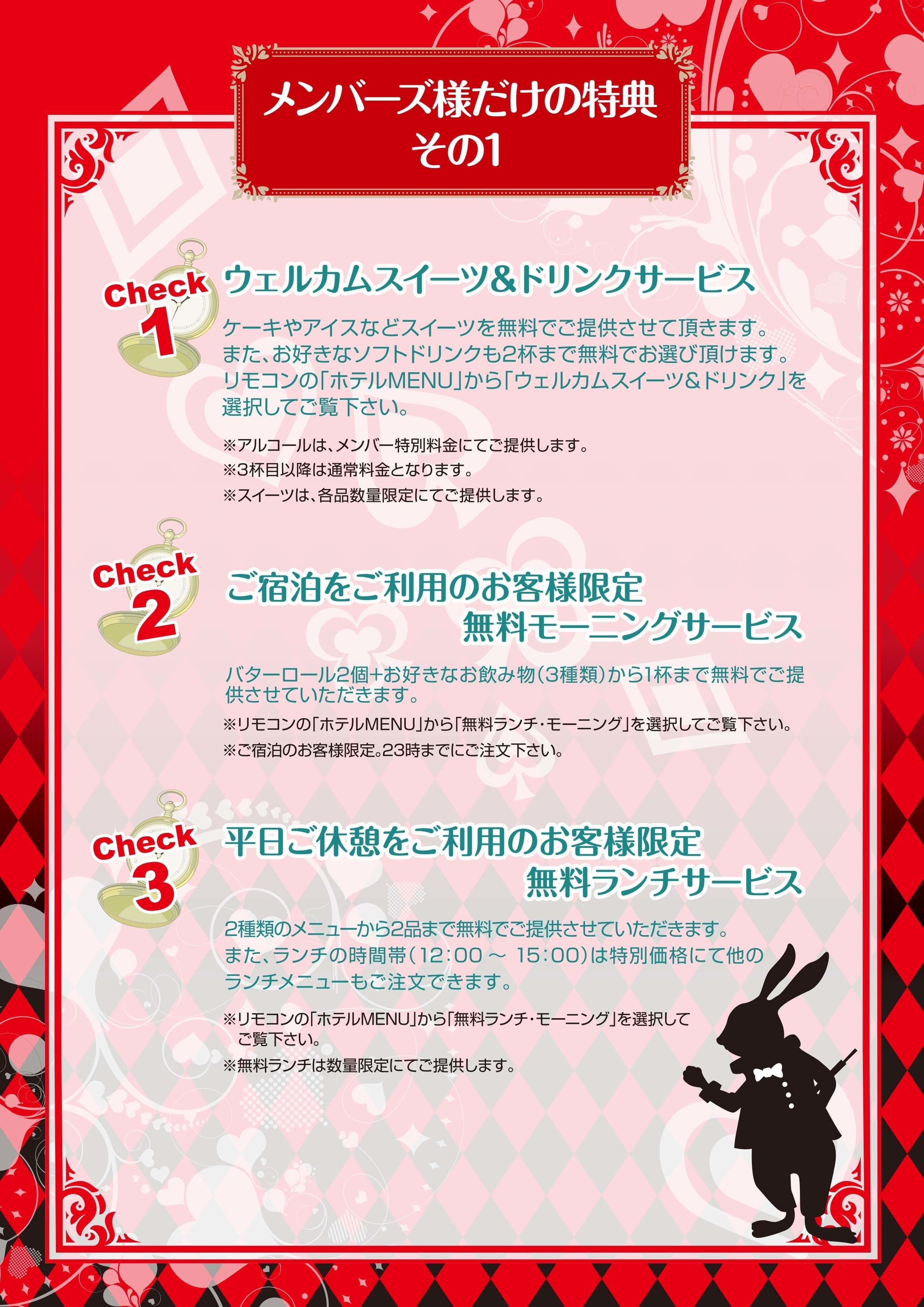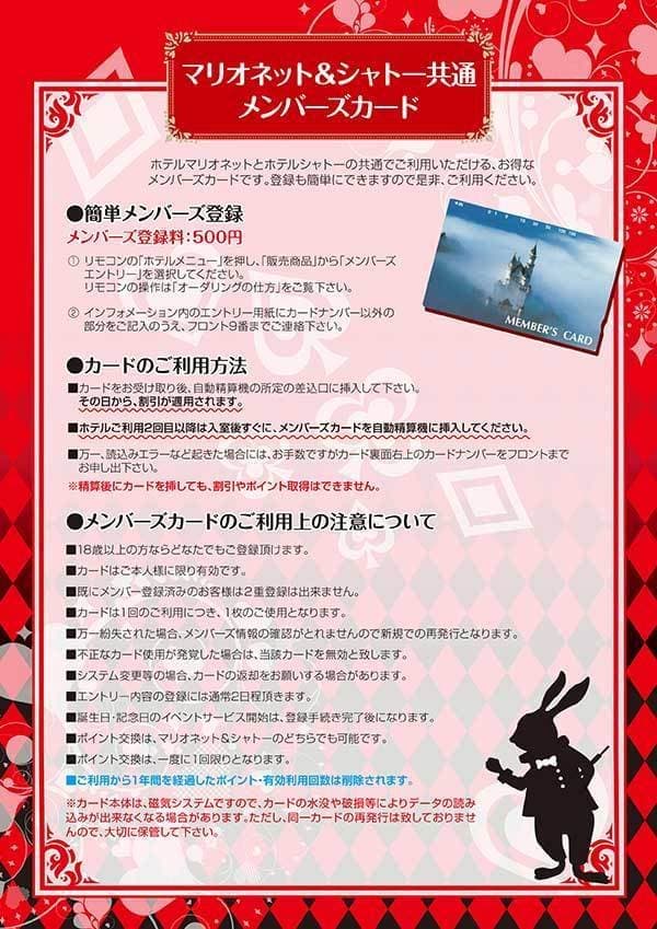 Membrs Merit メンバーズ特典(シャトー&マリオネット共通)簡単メンバーズ登録 (メンバー登録料500円) リモコンの「ホテルメニュー」を押し、「販売商品」から「メンバーズエントリー」を選択ください。 インフォメーション内のエントリー用紙にカードメンバー以外の部分をご記入の上、フロント9番までご連絡ください。 シャトー&マリオネット共通メンバーカード ご入会方法及びご利用方法について メンバーズ様だけの特典1 メンバーズ様だけの特典2
